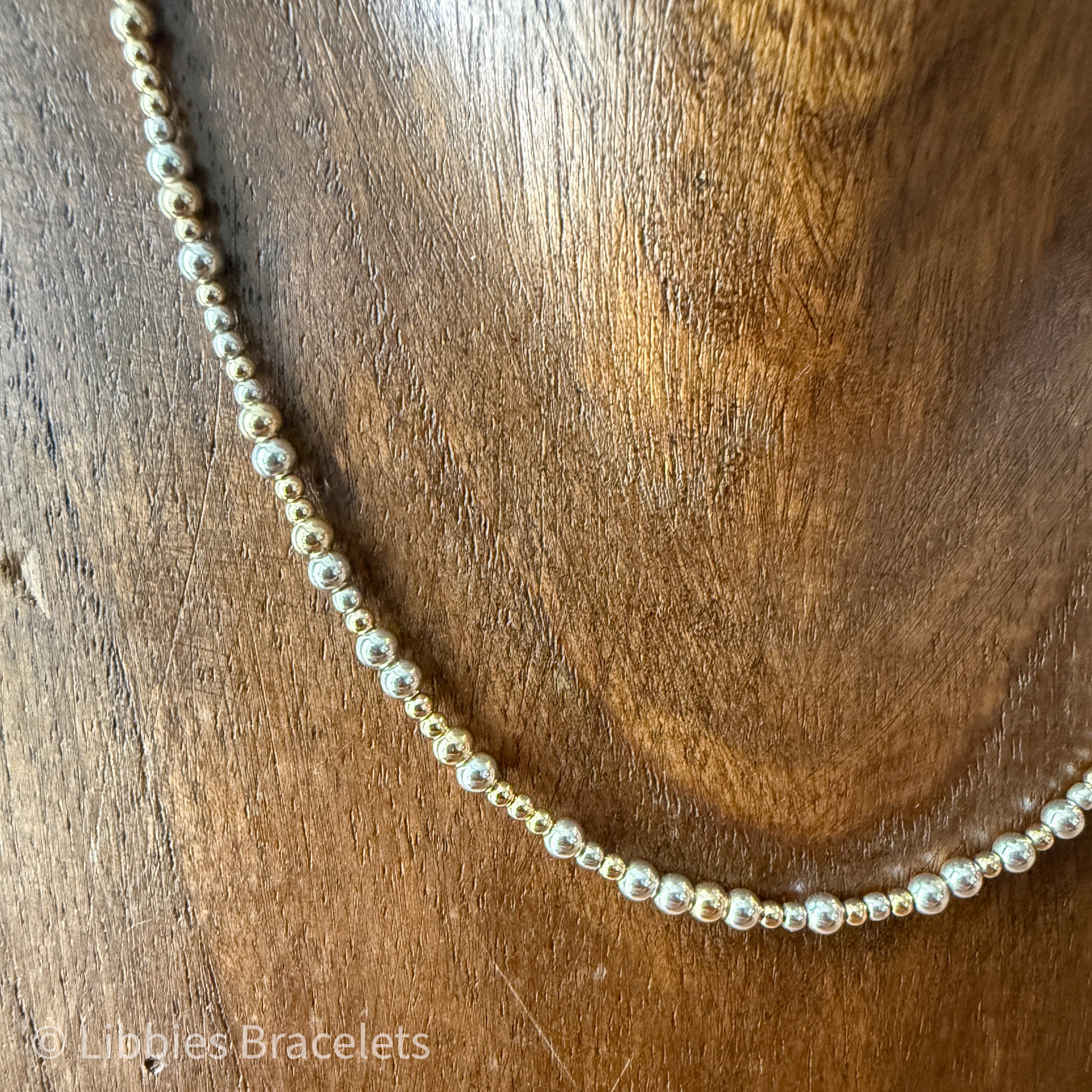 Expertly crafted with a mix of gold-filled and sterling silver beads, this Mixed Metals Necklace is the perfect addition to your jewelry collection. The varying sizes of 2mm and 3mm beads add a unique touch to any outfit, making it a versatile and stylish choice for any occasion. 17” inches in length.